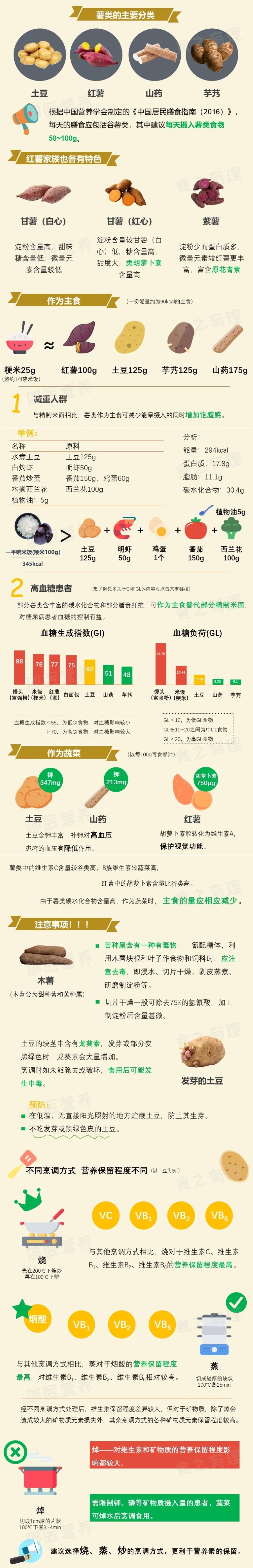薯类是膳食的组成成分,它们除了提供丰富的碳水化合物外,还有较多的矿物质,兼有谷类和蔬菜的双重优点。