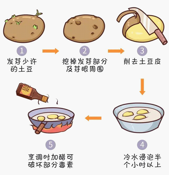 土豆发芽中的杀手是一个叫——龙葵素的物质,它是一种有毒生物碱,人吃了中毒轻为恶心、呕吐、腹泻,严重则为心脏衰竭、呼吸中枢麻痹导致死亡。